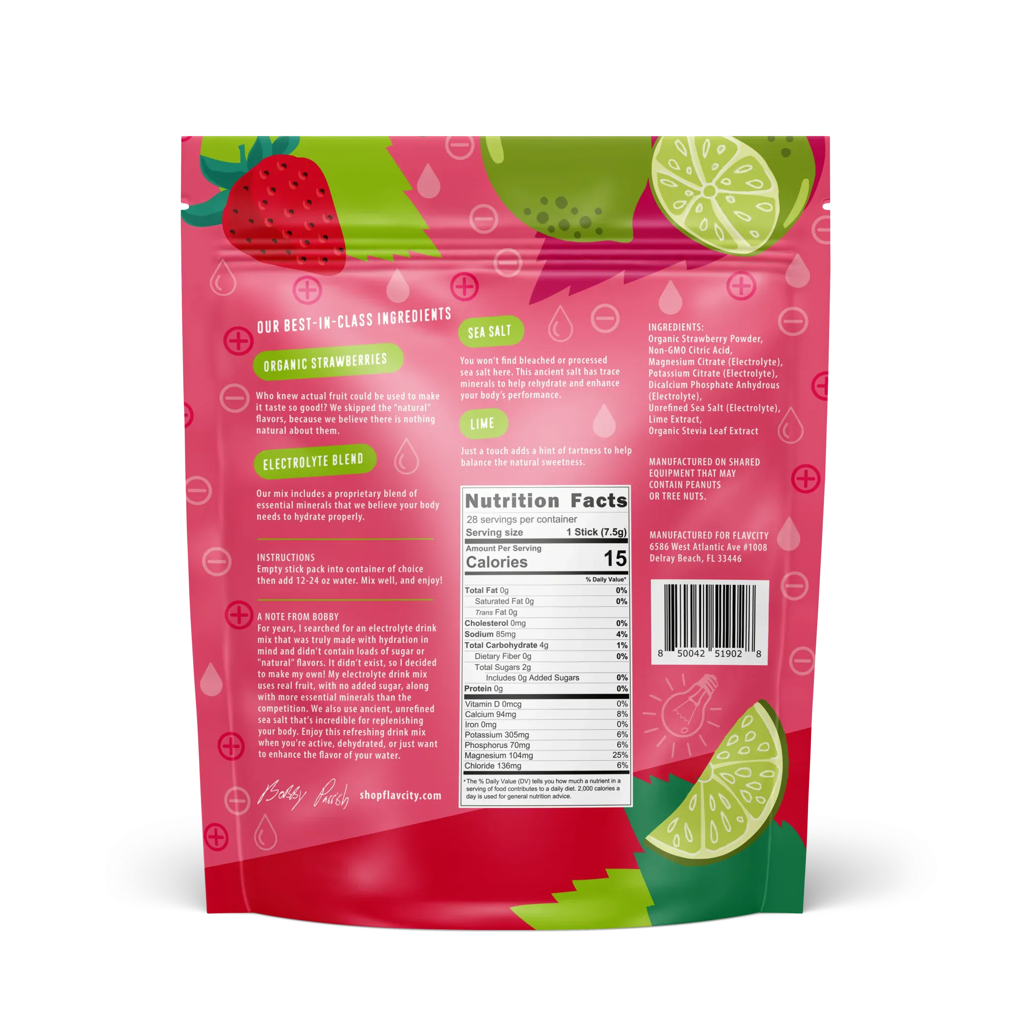 Organic Strawberry Powder, Non-GMO Citric Acid, Magnesium Citrate, Potassium Citrate, Dicalcium Phosphate Anhydrous, Unrefined Sea Salt, Lime Extract, Organic Stevia Leaf Extract