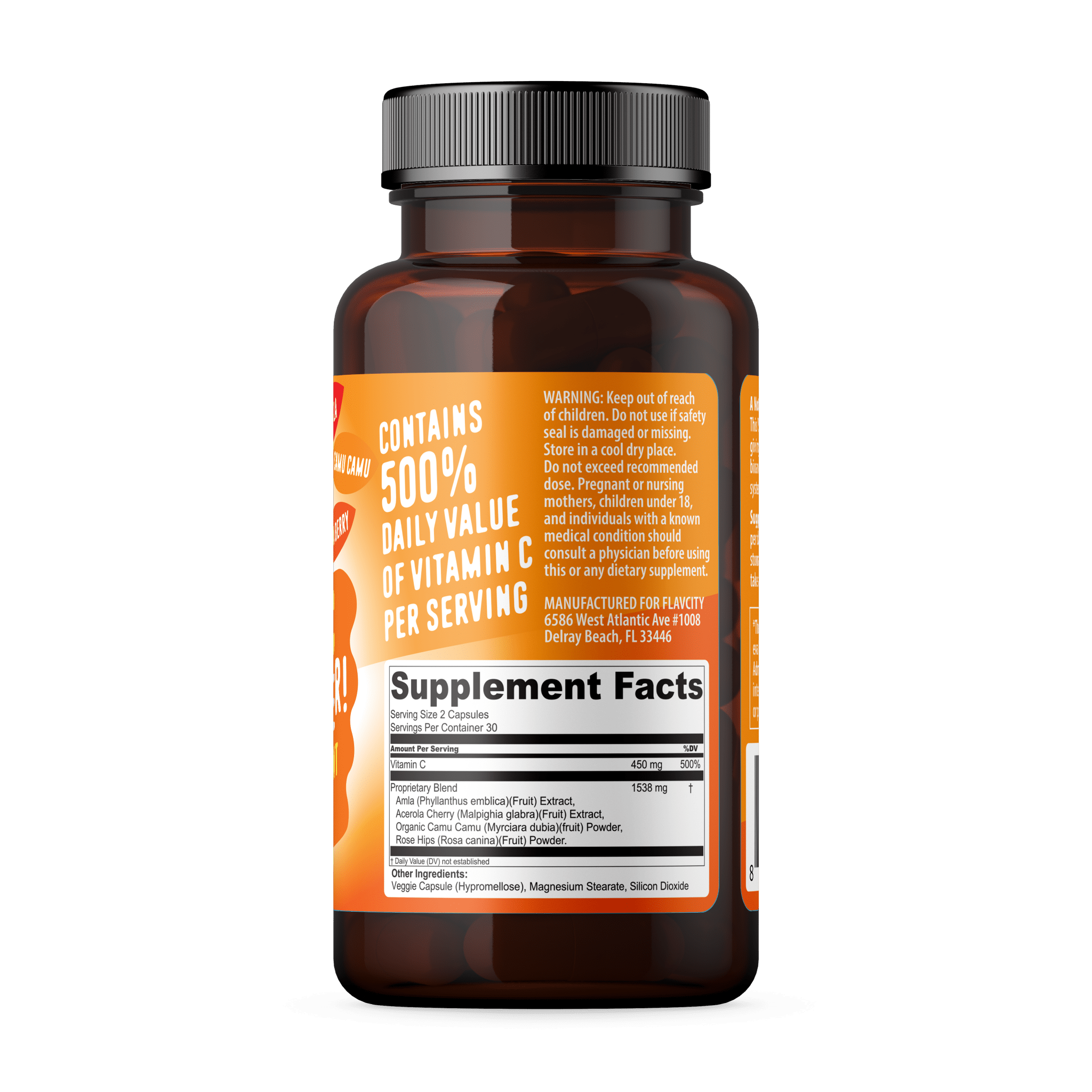 Veggie Capsule (Hypromellose), Amla Extract, Acerola Cherry Extract, Organic Camu Camu Powder, Rose Hips Powder, Magnesium Stearate, Silicon Dioxide