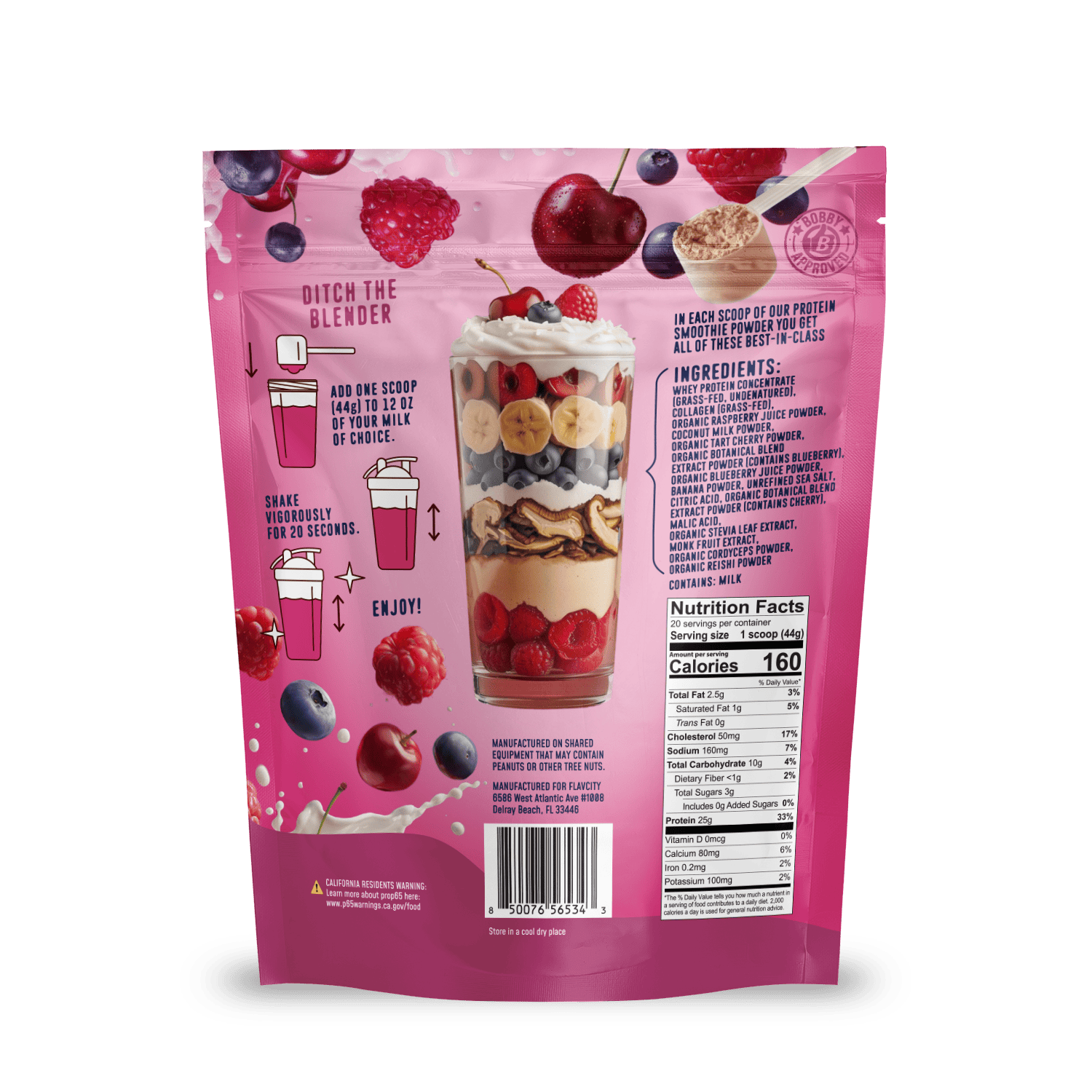 Our Cherry Berry Protein Smoothie blends juicy cherry and sweet blueberry for a vibrant, fruit-forward flavor made with 100% grass-fed whey. We keep it simple with real ingredients like organic cherry powder and coconut milk to round out that bold, berry-packed taste. Each serving packs: 25g of protein, 10g of collagen, fruits, and functional mushrooms (cordyceps & reishi). Rather than buying all the ingredients separately, everything you need is now packed into one scoop for only $2.99 per serving. And the best part? No blender needed—just add milk or water, shake, and enjoy.