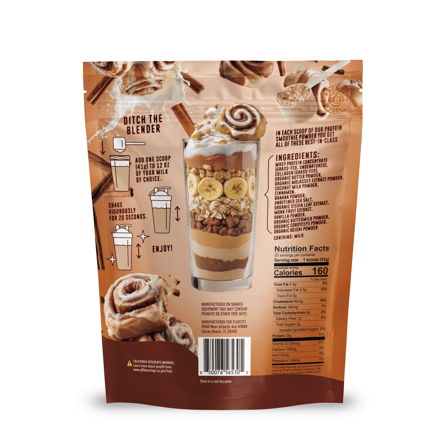 Our Cinnamon Roll Protein Smoothie brings all the warm, gooey bakery-style flavor you love—made with ingredients you can feel good about. Each serving delivers 25g of protein and 10g of collagen for a delicious, satisfying boost. We keep it simple with real ingredients like actual cinnamon and organic butter powder to round out that cozy cinnamon-swirl taste. Rather than buying protein, collagen, adaptogens, and fruit separately, everything you need is packed into one scoop for only $2.99 a smoothie. And there’s no blender needed—just add milk or water, shake, and enjoy.
