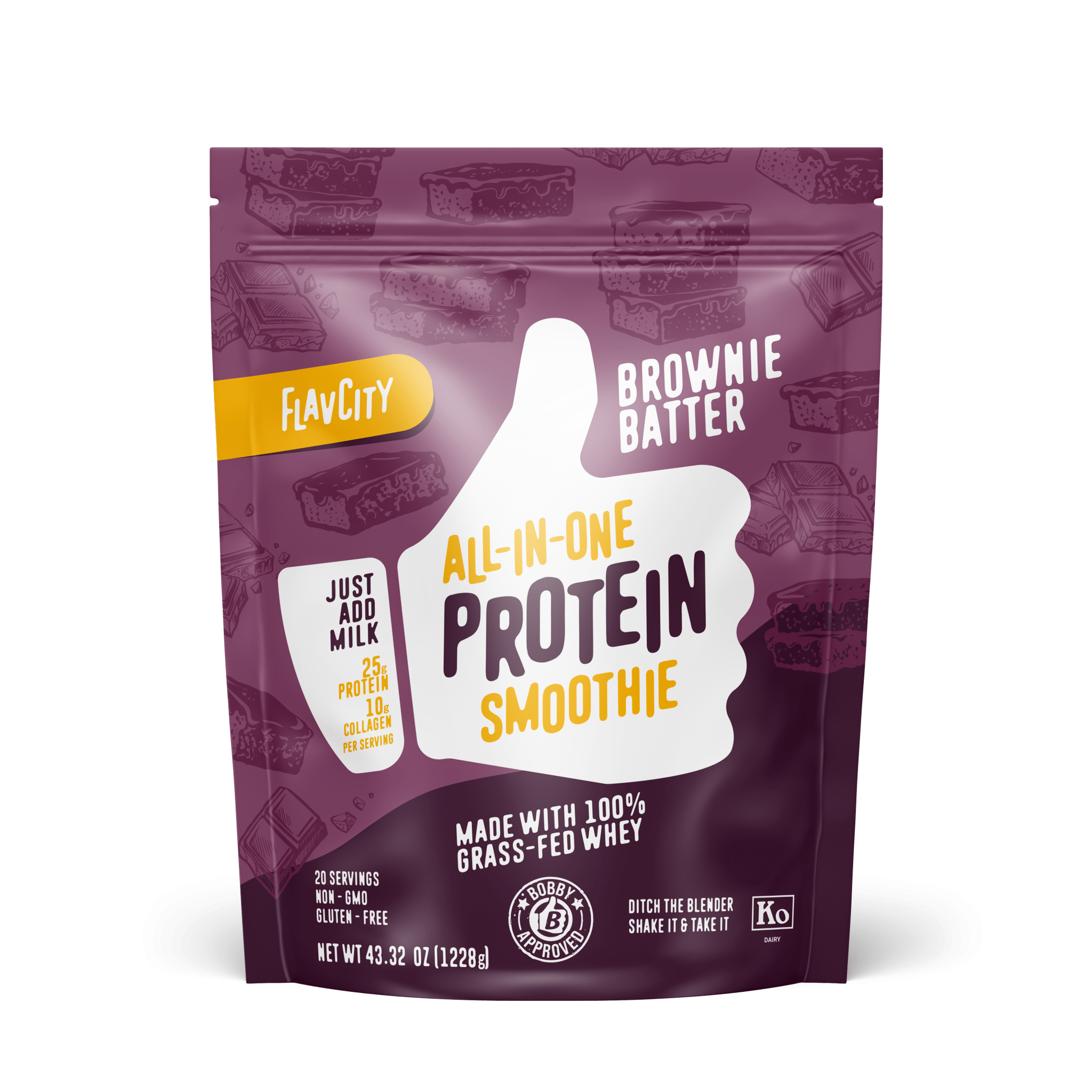 Two 20-serving bags of FlavCity’s most popular All-in-One Protein Smoothie flavors; Vanilla Cream and Brownie Batter. These whey-based smoothies are the perfect way to level up your energy after a great workout, or tackle a snack attack! Both flavors fuel your body with 25g of protein and 10g of collagen per serving. They’re not only delicious, they’re made with our best-in-class, “Bobby Approved” ingredients! You only need to add your favorite milk of choice, shake it, take it and enjoy!