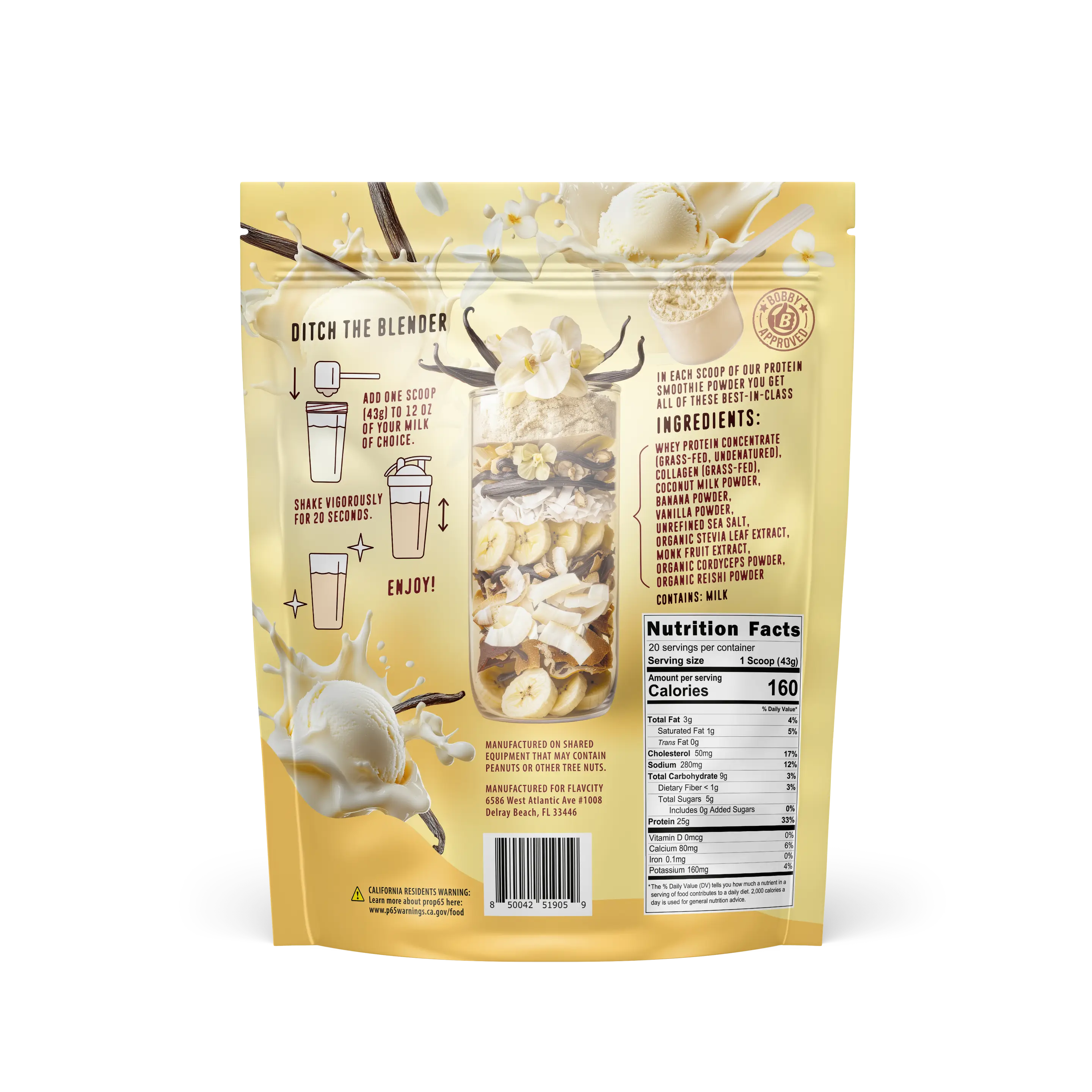 A yellow and cream pouch of Shop FlavCity Vanilla Cream Protein Smoothie, highlighting 25g protein, 10g collagen, banana, coconut, and vanilla, with images of vanilla flowers and ice cream on the packaging.